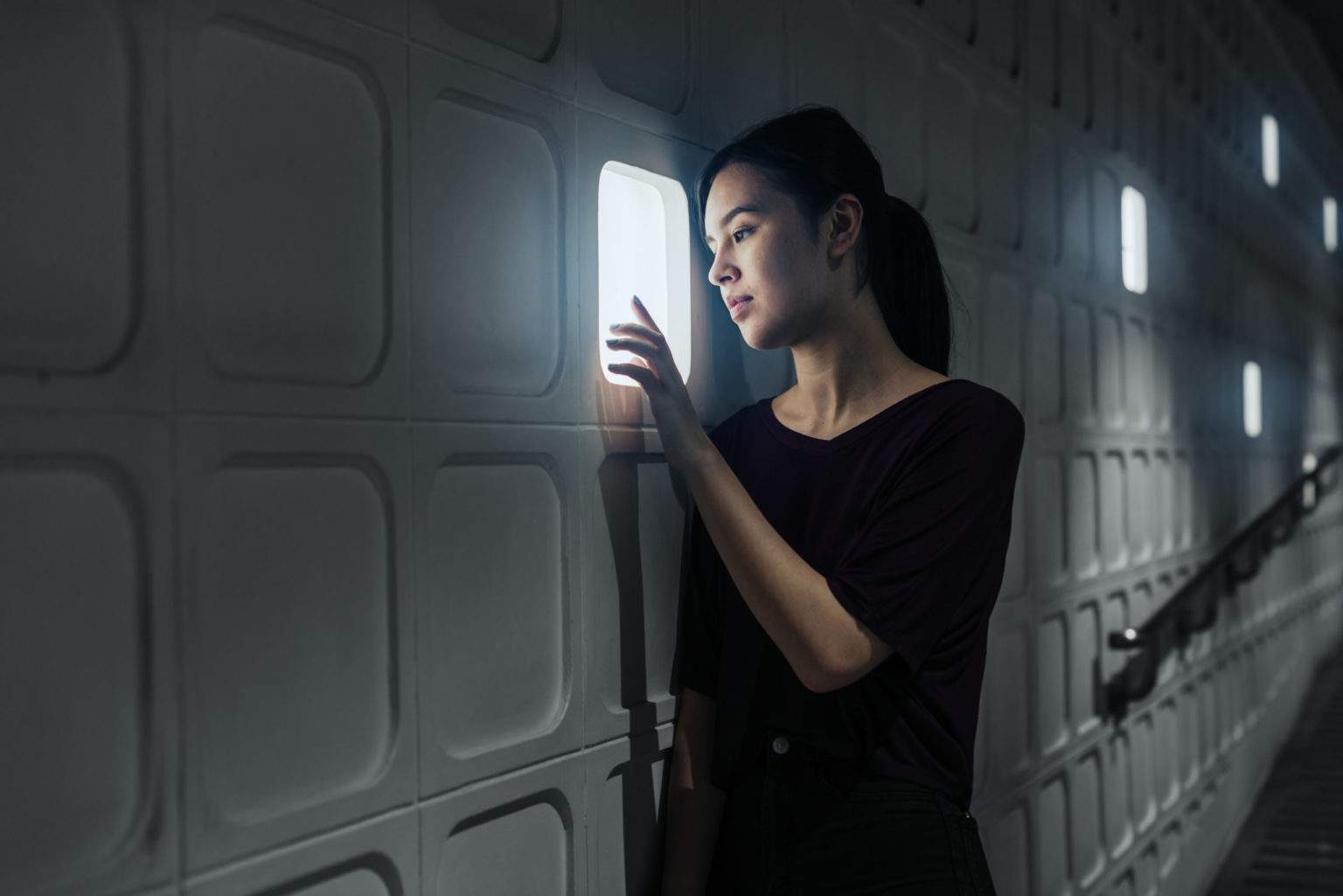 Girl in a futuristic concrete home