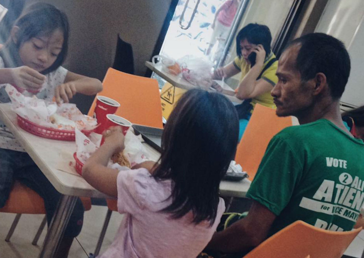 ဖခင်ရဲ့ချစ်ခြင်းမေတ္တာတွေ ဘယ်လောက်နက်ရှိုင်းလည်းဆိုတာကို ဒီတစ်ခေါက်ဖော်ပြမဲ့ဖိလစ်ပိုင်နိုင်ငံက ဖခင်တစ်ဦးကသက်သေပြလိုက်တာပါပဲ ဖြစ်စဉ်ကတော့သားအဖ 3 ယောက်ဟာ Joll ဆိုတဲ့ကြက်ကြော်ဆိုင်မှာ ဝင်ပြီး စားသောက်နေကြတာပါ ။