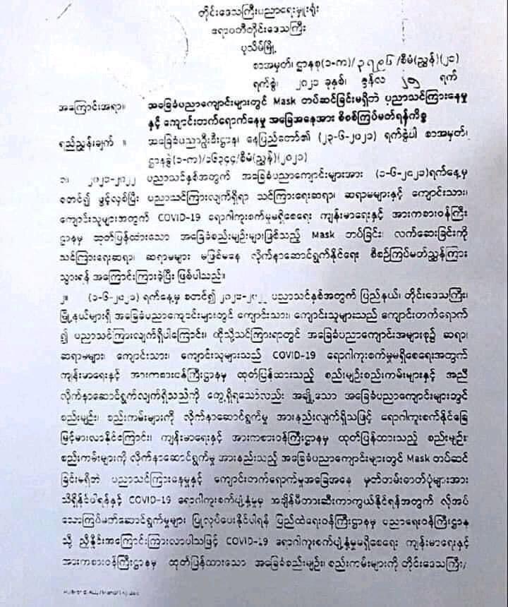 ဧရာဝတီတိုင်းဒေသကြီးအတွင်းက မြောင်းမြမြို့၊ မအူပင်မြို့၊ လပွတ္တာမြို့တွေမှာ ကျောင်းဆရာမတွေနဲ့ကျောင်းသား ကျောင်းသူအချို့ ကိုဗစ်ကူးစက်ခံနေရပေမယ့် စာသင်ကျောင်းတွေကို ယာယီရပ်နားခြင်းမရှိဘဲMask တပ်ပြီး စာဆက်သင်ကြားဖို့ စစ်ကောင်စီရဲ့ လက်အောက်ခံ ဧရာဝတီတိုင်းဒေသကြီးပညာရေးမှူးရုံးကအကြောင်းကြားစာထုတ်ပြန်ခဲ့ပါတယ်။