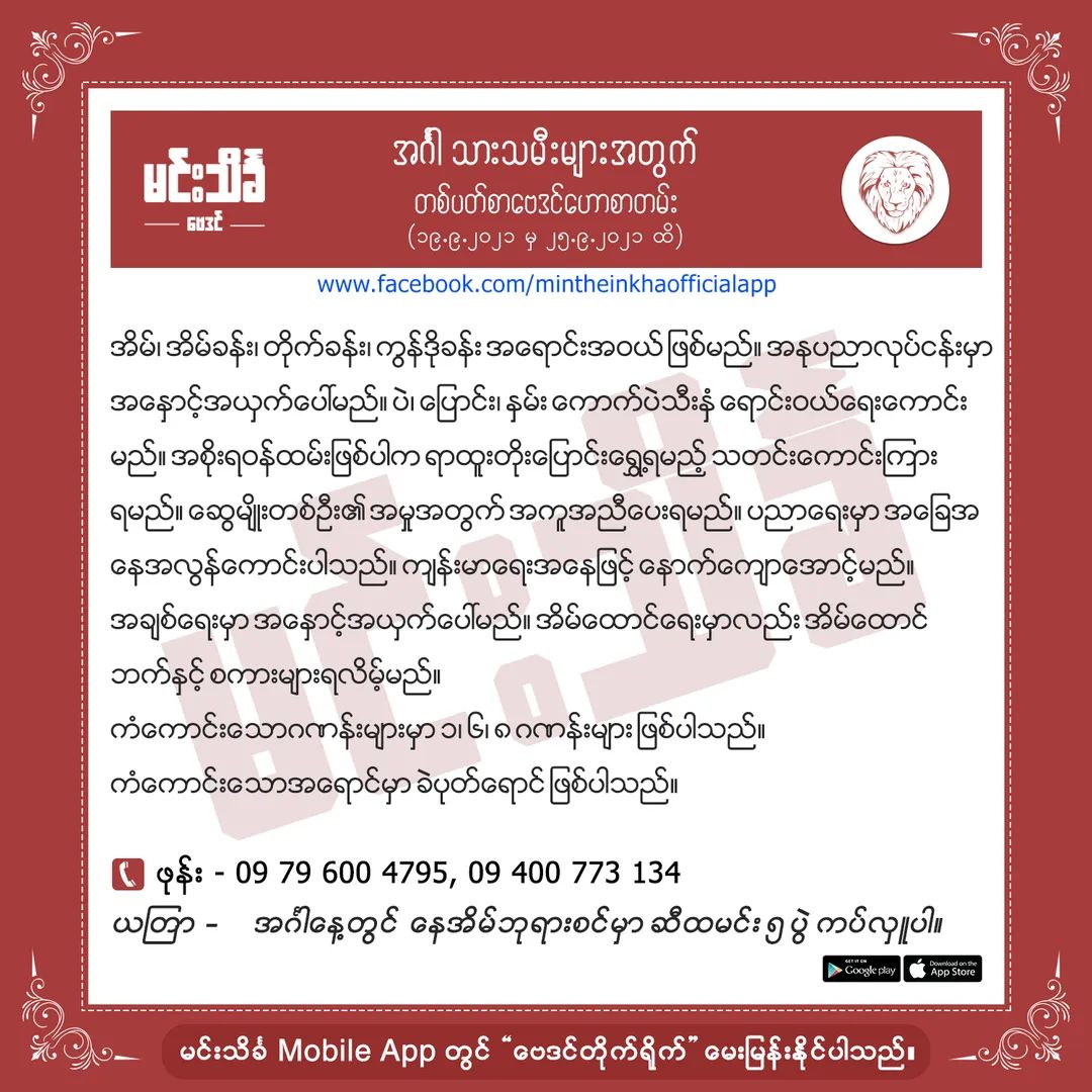 အဘဒေါက်တာ မင်းသိင်္ခ နည်းစနစ်အတိုင်း ဟောပြောထားသော ခုနှစ်ရက်သားသမီးများအတွက် တစ်နေ့တာ ဆောင်ရန် ရှောင်ရန် ဟောစာတမ်းကို နေ့စဉ်တင်ပေး